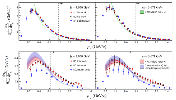 面對這一挑戰(zhàn),團(tuán)隊利用BESIII能量掃描數(shù)據(jù),精確測量了帶電pion和Kaon介子的單舉產(chǎn)生微分截面,最高精度達(dá)1%~2%。結(jié)合NPC合作組(Non-perturbative Physics Collaboration)的全局?jǐn)?shù)據(jù)擬合研究,這一新的測量結(jié)果與基于次次領(lǐng)頭階精度的QCD理論分析相符合,尤其是大動量強(qiáng)子區(qū)域。該研究成果為檢驗(yàn)低能區(qū)QCD因子化定理及部分子碎裂過程中同位旋對稱性的有效性提供了有力的實(shí)驗(yàn)支持,對深入理解強(qiáng)相互作用動力學(xué)具有重要意義。