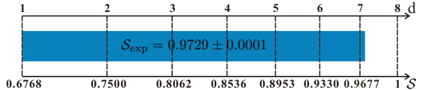 在實(shí)驗(yàn)實(shí)現(xiàn)方面,團(tuán)隊(duì)采用路徑和偏振自由度混合編碼構(gòu)建八維子空間,提高了高維移位操作和構(gòu)建高維測(cè)量的效率,展示出優(yōu)越的可擴(kuò)展性?;诠蚕淼陌司S糾纏,通過(guò)全出口高維測(cè)量,實(shí)現(xiàn)對(duì)發(fā)送方編碼信息的隨機(jī)解碼。實(shí)驗(yàn)測(cè)得成功率S=0.9729±0.0001,超過(guò)七維糾纏所達(dá)到的理論成功率上界0.9677,認(rèn)證了所共享的糾纏態(tài)維度不低于八維。
